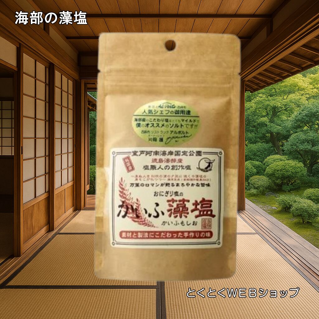 太平洋の黒潮が迫る徳島海部沿岸の新鮮な海水と海藻を平釜に注ぎ、薪をくべ続けてじっくりと結晶にした、塩職人こだわりの手作り塩です。「藻塩」は弥生時代から海辺の民により作られていて、平安時代の和歌にも数多く登場するなど、とても由緒ある「伝説のお塩」とされています。原料に海部産の海藻を加えることで、まろやかな旨みが広がり、風味ある「古代のお塩」を再現しています。おにぎり・揚げ物・お肉・魚介類・トマトなどの野菜サラダ等、あらゆる調理にご利用いただけます。