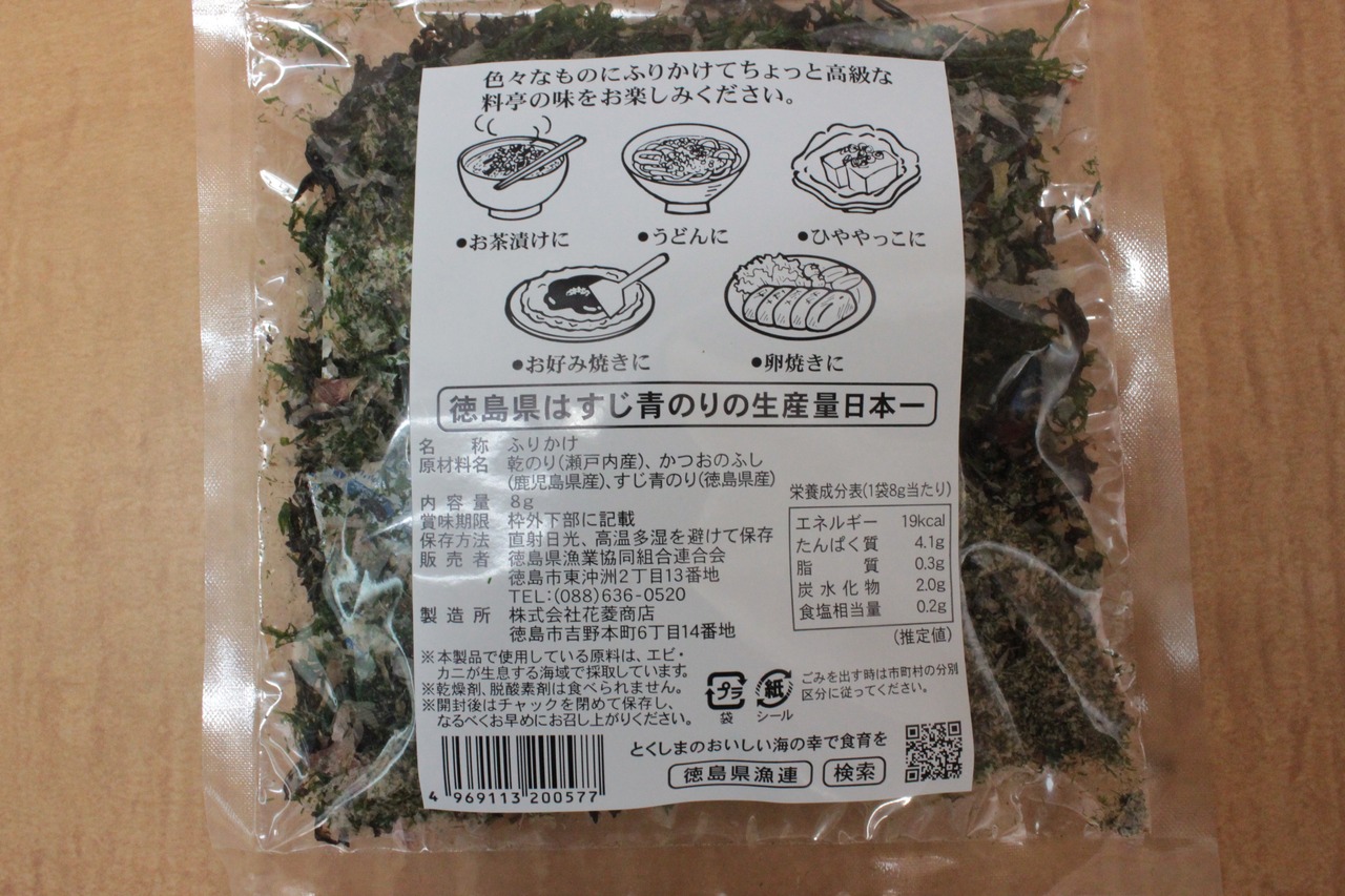 生産量日本一といわれている徳島県産のすじ青のり、瀬戸内産のばら干しのり、鹿児島県産のかつお節の素材を活かしブレンドした、贅沢なふりかけです。すじ青のりは食用となる青のり類のなかで最も美味で、風味が良いとされています。ばら干しのりは、製造工程で海苔を細かく裁断せず、原藻のまま乾かしたものです。風味豊かな香りを活かすため味付けはせず、海苔本来の香りの強さと歯ごたえのある食感が特徴です。シンプルにごはんやお豆腐などにひとふりし、お醤油をたらすと芳香な香りに食がすすみます。他にも、お好み焼きや焼きそば、うどんにふりかけたり、お茶漬けや卵焼きにしても美味しくお召し上がりいただけます。色々なものにふりかけて、ちょっと高級な料亭の味をお楽しみください。