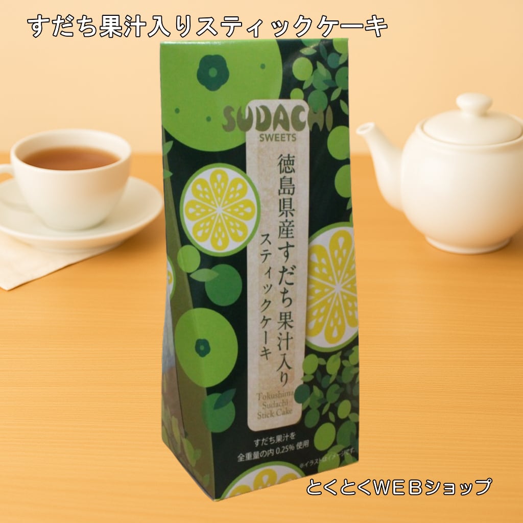 すだちの清々しい香りとさわやかな味わいが特徴のスティックケーキです。ご自宅でのお茶菓子にはもちろん、パッケージもおしゃれで個包装になっておりますので、お土産にもおすすめです。