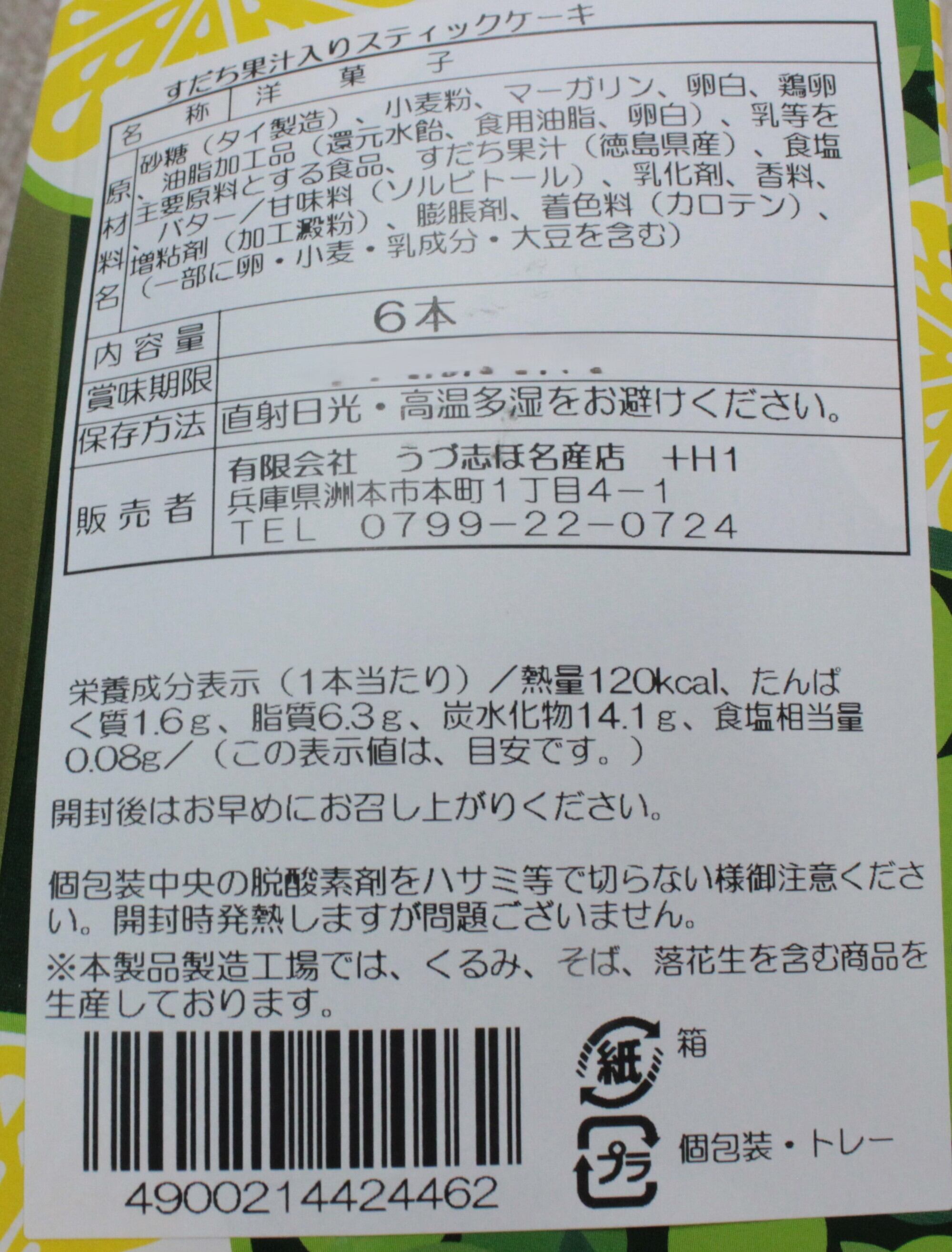 原材料 砂糖(タイ製造)・小麦粉・マーガリン・卵白・鶏卵・油脂加工品(還元水飴・食用油脂・卵白)・乳等を主要原料とする食品・すだち果汁(徳島県産)・食塩・バター/甘味料(ソルビトール)・乳化剤・香料・増粘剤(加工澱粉)・膨張剤・着色料(カロテン)・(一部に卵・小麦・乳成分・大豆を含む)