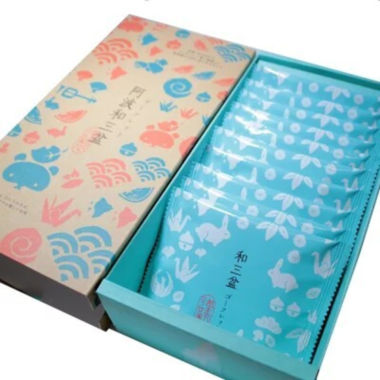 四国東部で伝統的手法で作られている数少ない国産の砂糖「和三盆糖」を使用した、やさしい味わいのゴーフレットです。ご家庭でのお茶うけに、また、パッケージも可愛らしいデザインですのでお土産にもおすすめです。